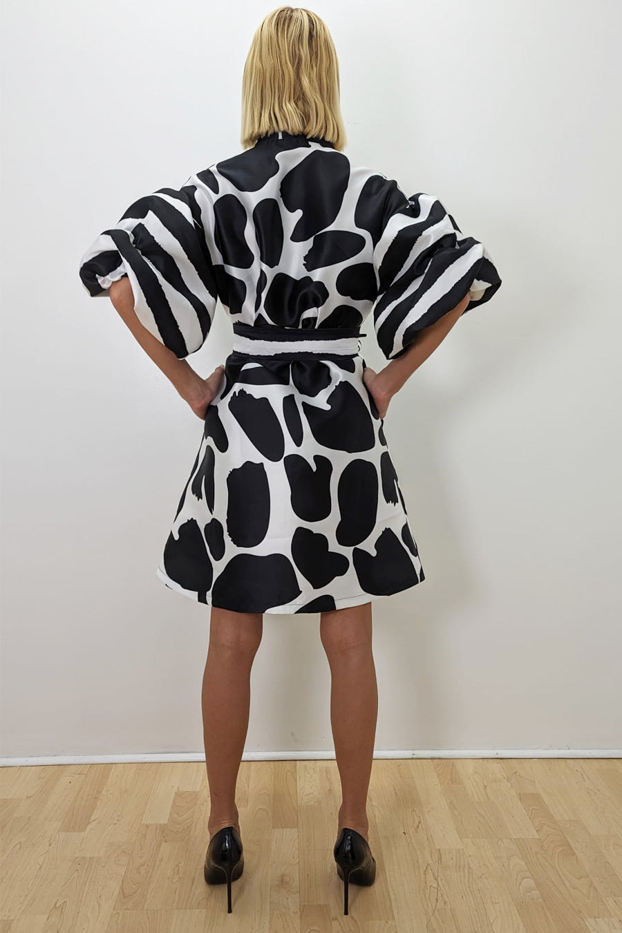 Puff Sleeve Button Down High Neck Wrap Belt Short Dress